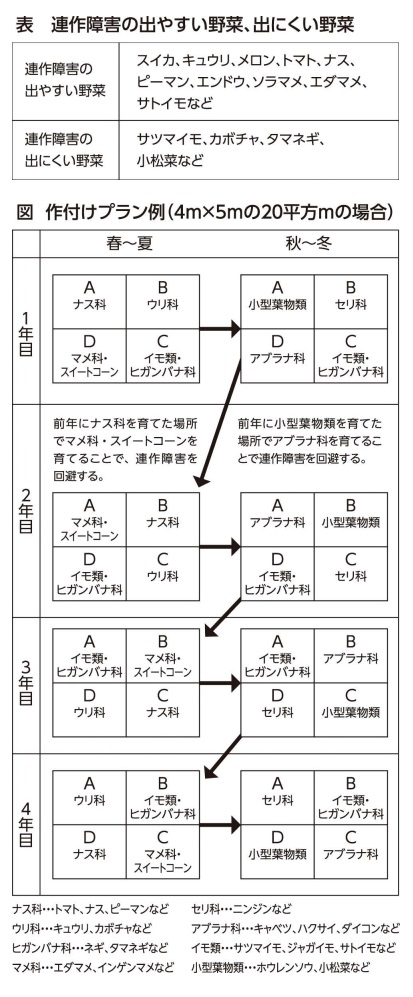同じ畑に同じ野菜を連続して作ることを「連作」といいます。連作すると生長に障害が出る野菜があります。エンドウは一度作ると、4、5年は作れません。ナス、トマト、ソラマメ、サトイモなどは3、4年、レタス、ハクサイ、イチゴなどは2年、ホウレンソウ、コカブ、インゲンなどは1年です。サツマイモ、カボチャ、タマネギのように連作しても生長に障害が見られない野菜もあります(表)。