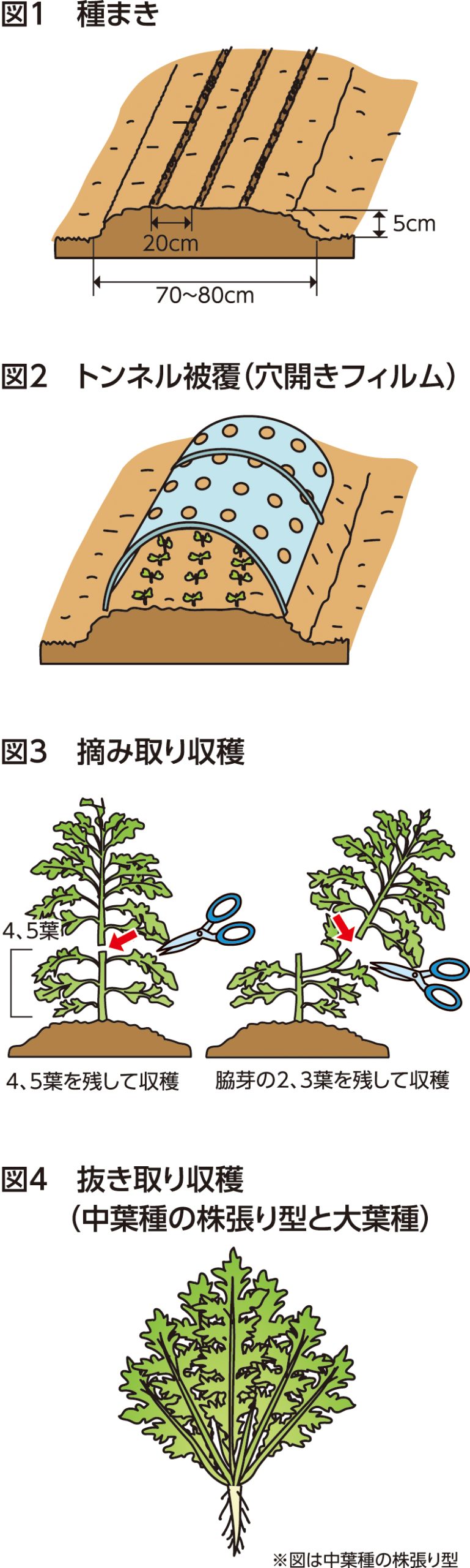 中葉種の株立ち型は、草丈が25~30cm程度になったら、葉4、5枚を残し、摘み取り収穫します。以後、伸びてきた脇芽の葉を2、3枚残して切り取ります(図3)。中葉種の株張り型と大葉種では、草丈が20~25cm程度に育ってきたら、株ごと抜き取り、または株元から刈り取って収穫します(図4)。なお、このトンネル栽培では晩春になると長日・高温の気象条件からとう立ち・開花が早くなり、長い期間の収穫はできません。