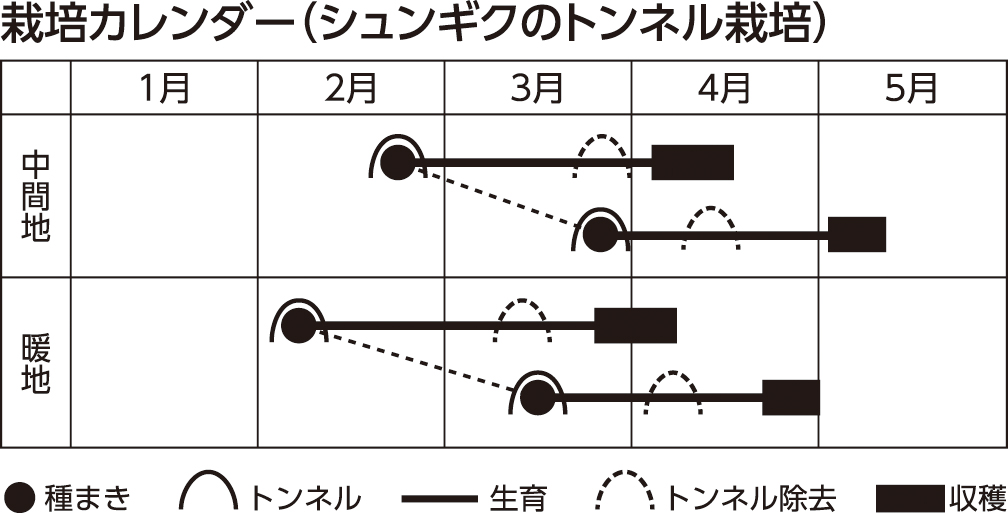 シュンギクのトンネル栽培 品種の使い分けに留意