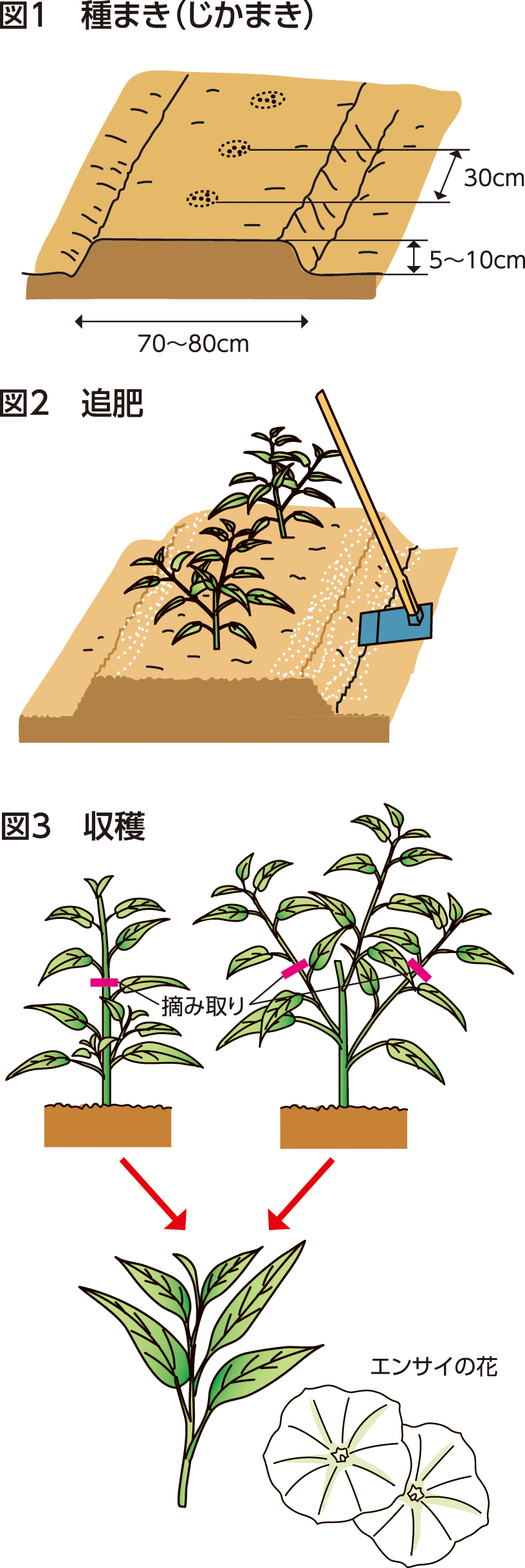準備した栽培床に株間30cmとし、深さ1、2cm、1カ所3、4粒じかまきします(図1)。苗作りをする場合は、7.5~9cmのポリポットに3、4粒まき、本葉3、4枚になったら苗を植え付けます。