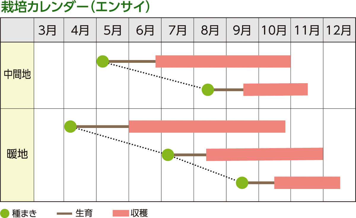 高温性で発芽適温は25度前後、生育適温は25~30度です。10度以下では発芽・生育しません。主に初夏に種まきし、夏から初秋にかけて収穫します。